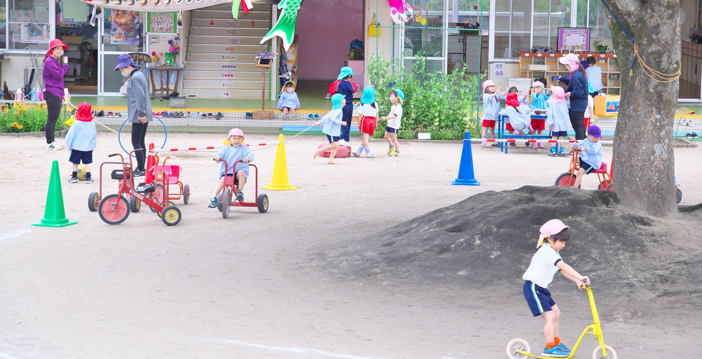 天竜第三幼稚園は、木陰の多い広々とした園庭に恵まれ、まわりには田畑や森、